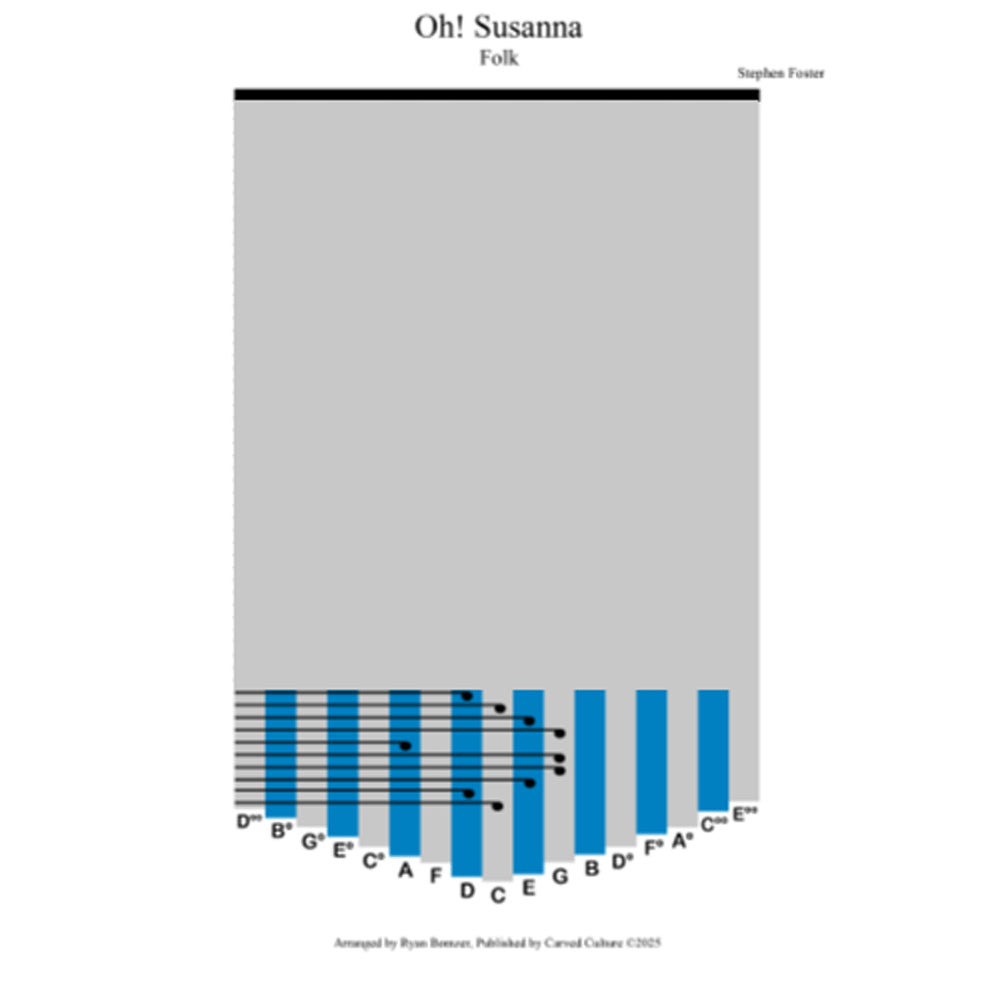 © Carved Culture. All rights reserved. This digital sheet music of Oh Susanna is based on a public domain melody. By purchasing this sheet music, you are granted a license for personal, educational, or non-commercial use only. Redistribution or commercial use of the sheet music is prohibited. All artwork and presentation of the sheet music are the property of Carved Culture.
