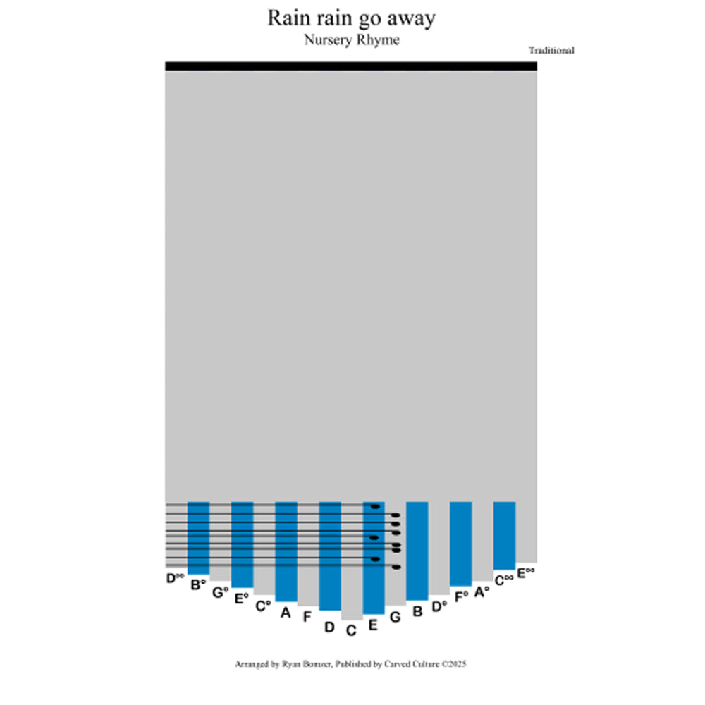 © Carved Culture. All rights reserved. This digital sheet music of Rain rain go away is based on a public domain melody. By purchasing this sheet music, you are granted a license for personal, educational, or non-commercial use only. Redistribution or commercial use of the sheet music is prohibited. All artwork and presentation of the sheet music are the property of Carved Culture.