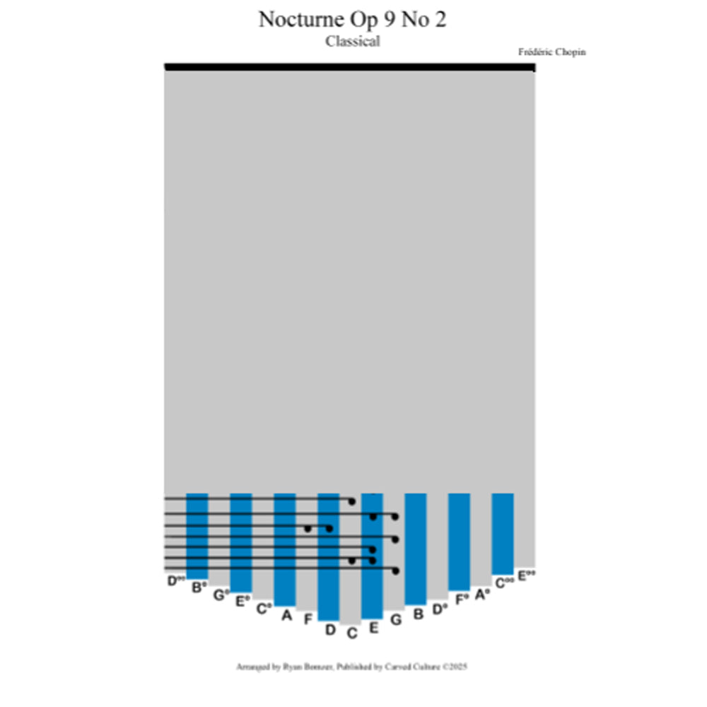 © Carved Culture. All rights reserved. This digital sheet music of Nocturne op 9 no 2 is based on a public domain melody. By purchasing this sheet music, you are granted a license for personal, educational, or non-commercial use only. Redistribution or commercial use of the sheet music is prohibited. All artwork and presentation of the sheet music are the property of Carved Culture.